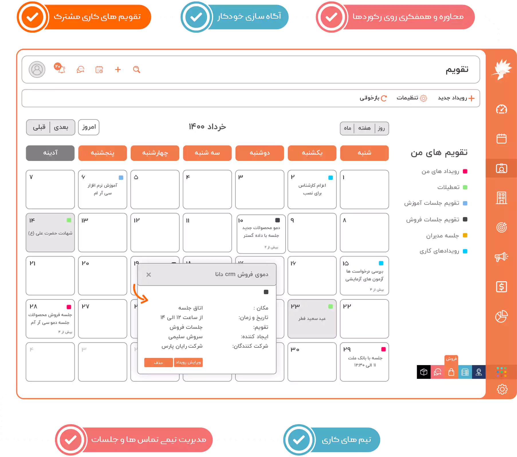 برای تیم های کاری مختلف تقویم های کاری مشترک بسازید و جلسات و کارها رو به صورت تیمی مدیریت کنید و اختلال جلوگیری کنید.
